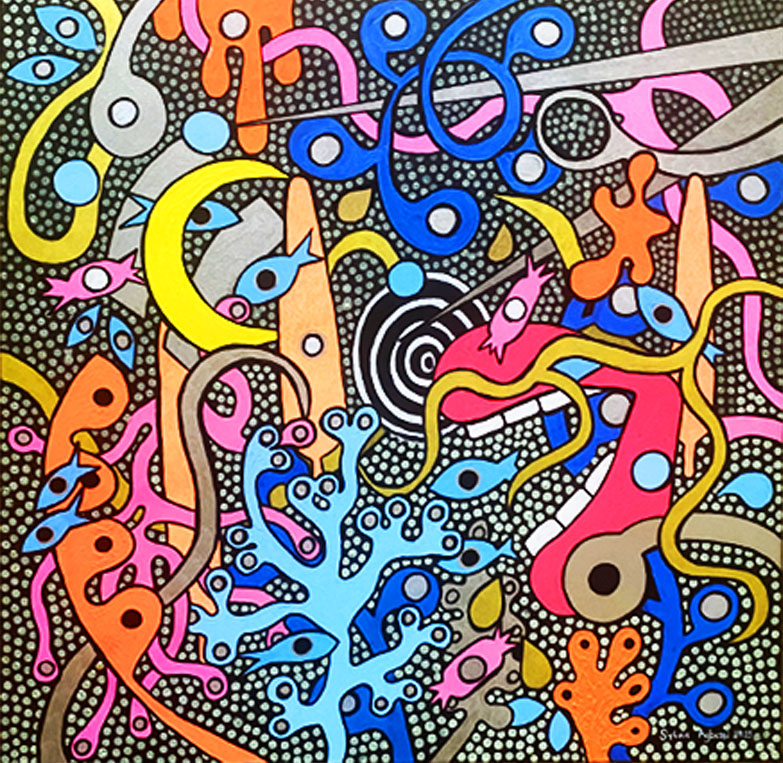 ce tableau dynamique crée une énergie palpable grâce à l’usage de couleurs vives et saturées : bleus profonds, turquoises électriques, corail éclatant, jaunes solaires et touches de violet mystique.
