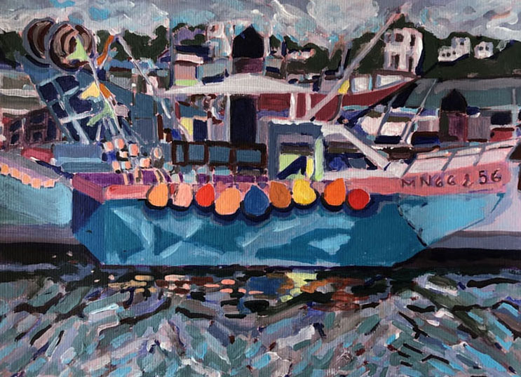 Cette peinture représente un bateau de pêche dans une ambiance maritime authentique. Le travail des couleurs, des textures et de la composition transmet une atmosphère à la fois calme et expressive, typique de l’univers de l’artiste.